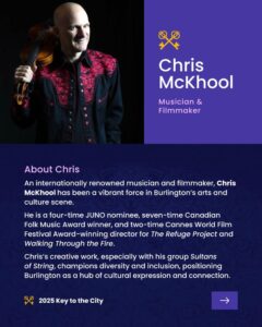 Burlington, ON – The City of Burlington is proud to announce that acclaimed musician, cultural changemaker, and community advocate Chris McKhool will be presented with the Key to the City on Wednesday, April 16, 2025, from 7:00 to 8:00 PM.